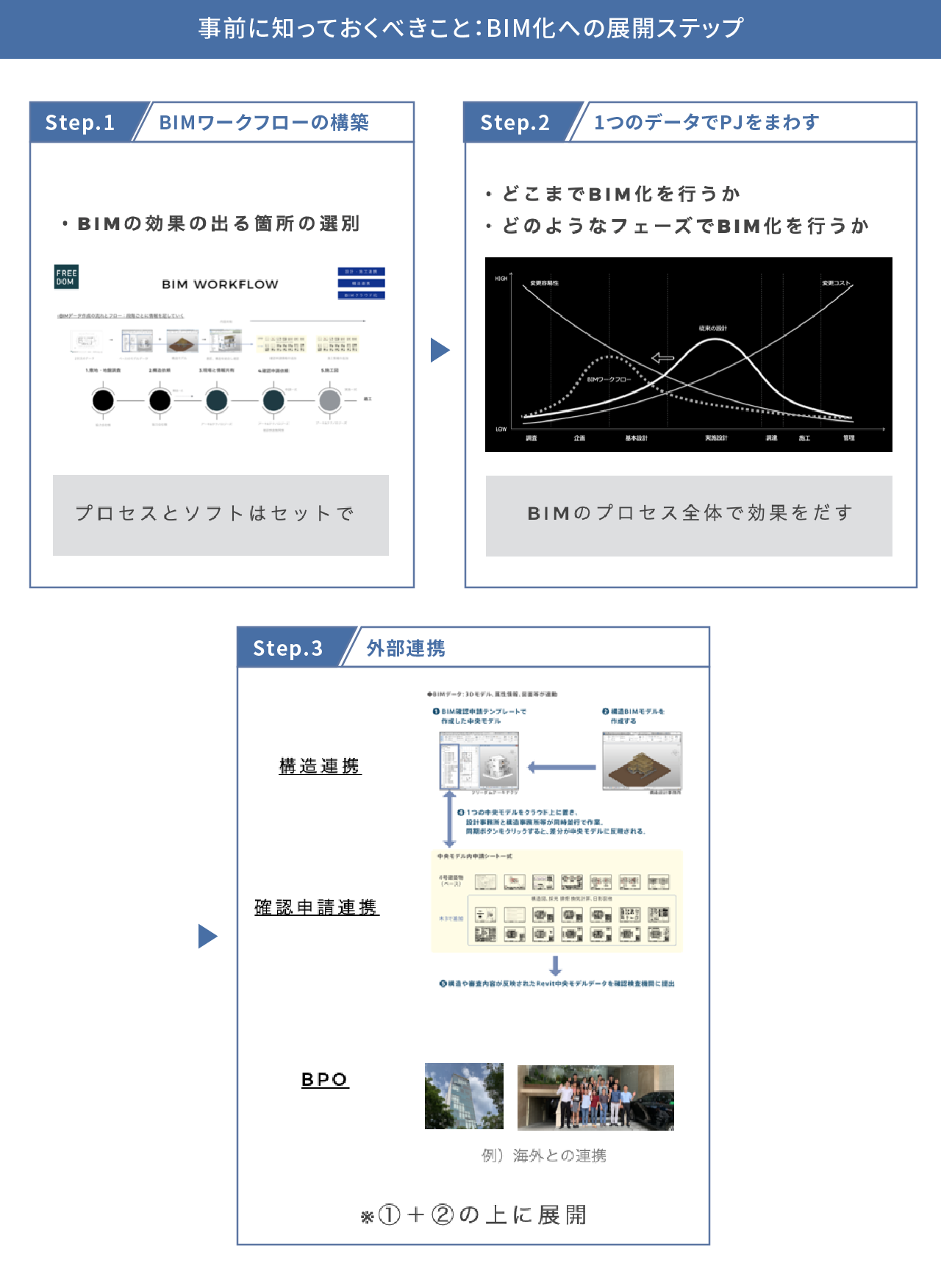 BIMワークフローを構築(ステップ①)し、プロジェクトではそのBIMワークフローを1つのデータでまわす(ステップ②)。この前提の上に、構造連携やBIM確認申請、そして、BPO等の連携を組み合わせていく。BIM確認申請までの流れをうまくつくれればBIM化の効果は抜群である。